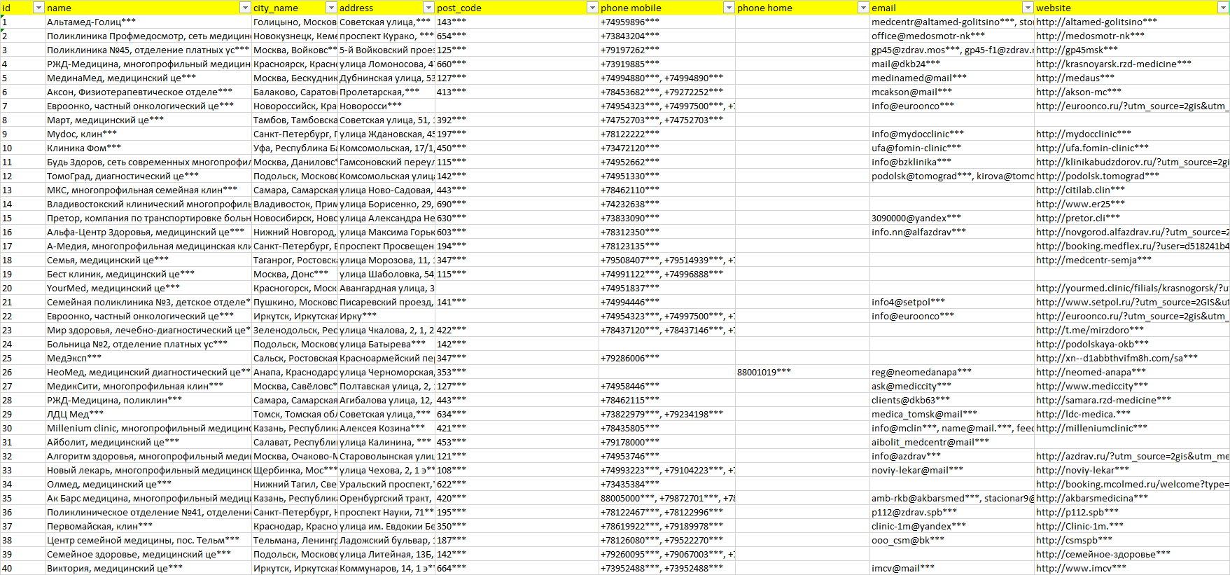 База организаций проктолог, вся Россия в формате Excel с эл. почтами, телефонами, сайтами, ссылками на соц сети, координатами и другой информацией. Скачайте демо версию, чтобы ознакомиться с данными.