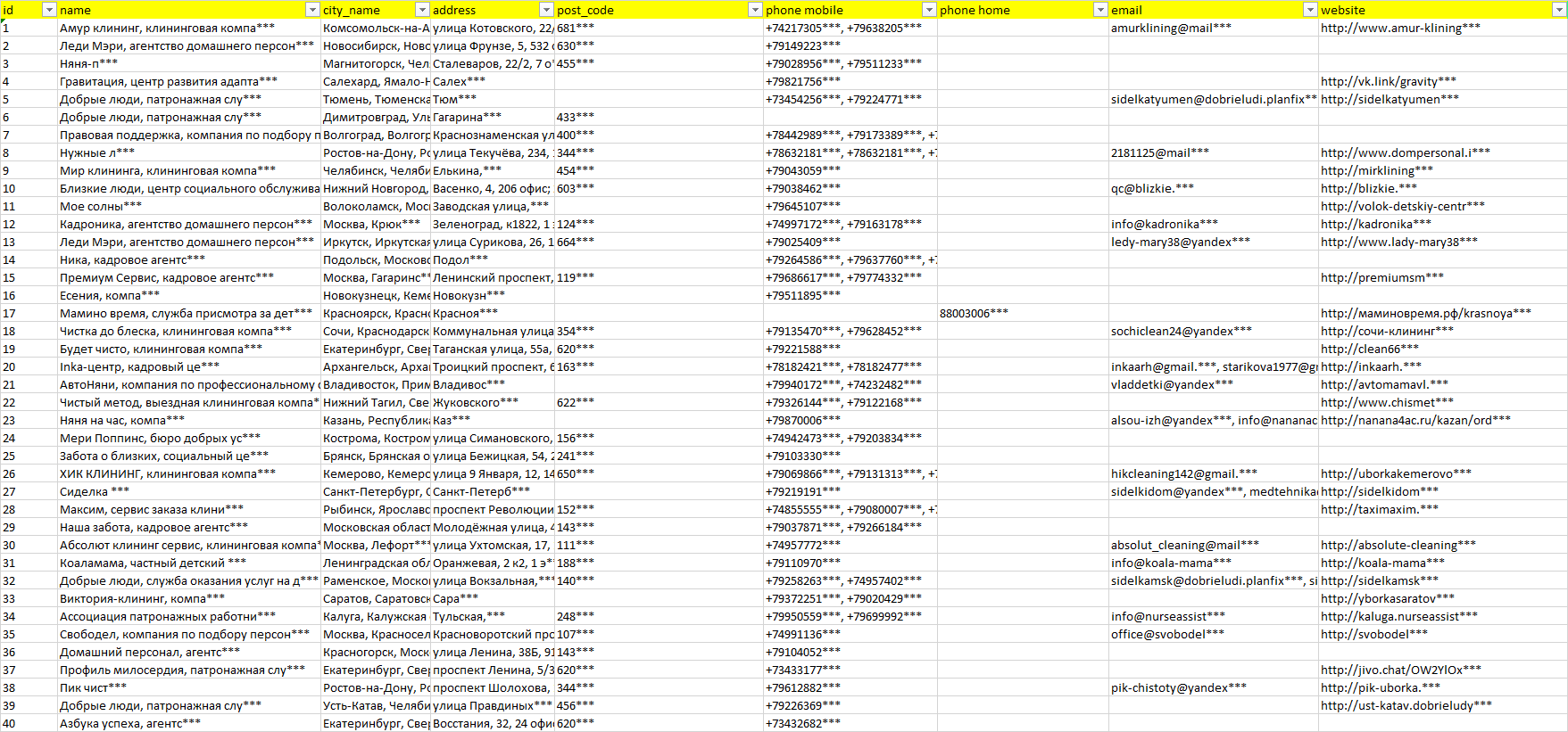 База компаний подбор домашнего персонала, вся РФ в формате Excel с эл. почтами, телефонами, сайтами, ссылками на соц сети, координатами и другой информацией. Скачайте демо версию, чтобы ознакомиться с данными.