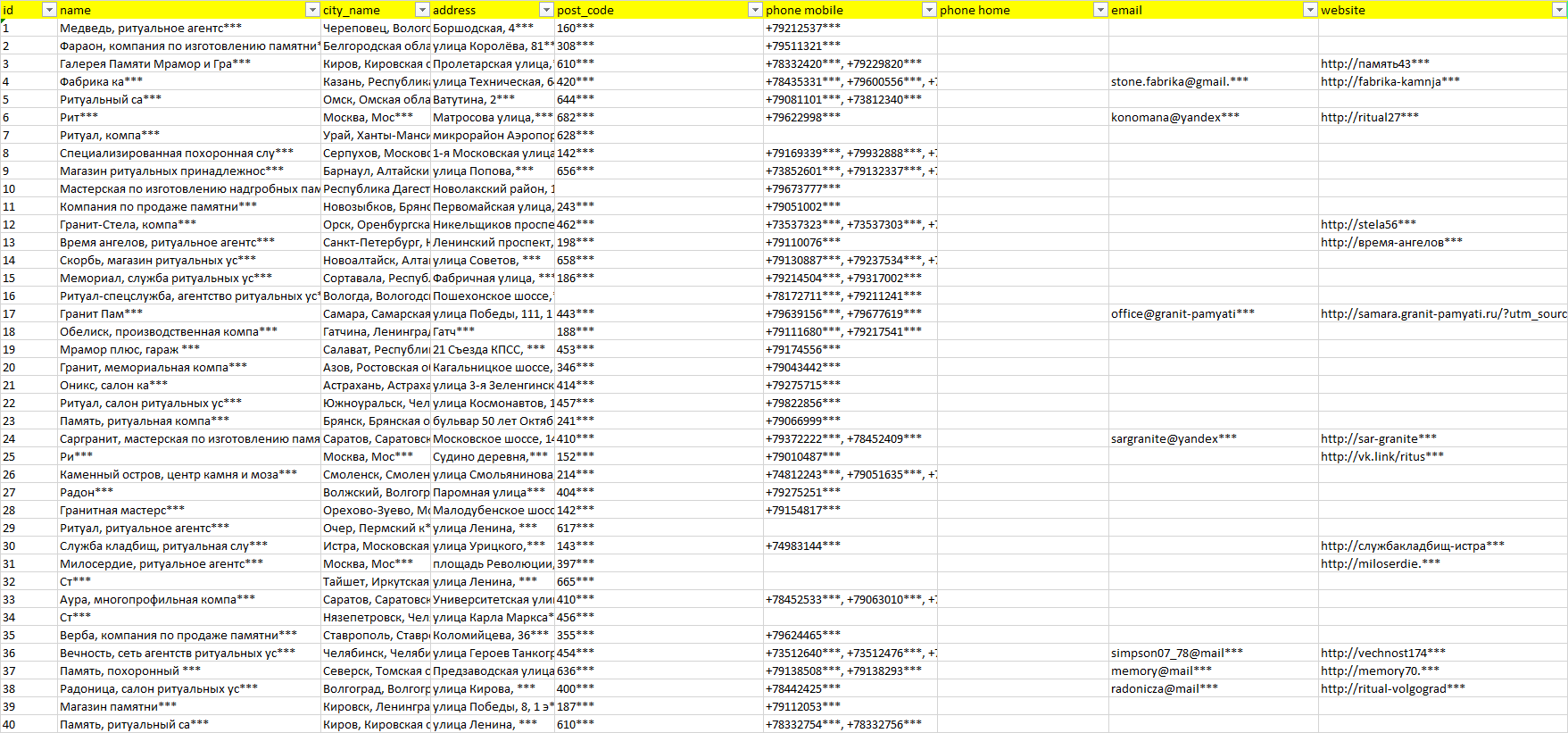База компаний памятники и надгробия, вся РФ в формате Excel с эл. почтами, телефонами, сайтами, ссылками на соц сети, координатами и другой информацией. Скачайте демо версию, чтобы ознакомиться с данными.