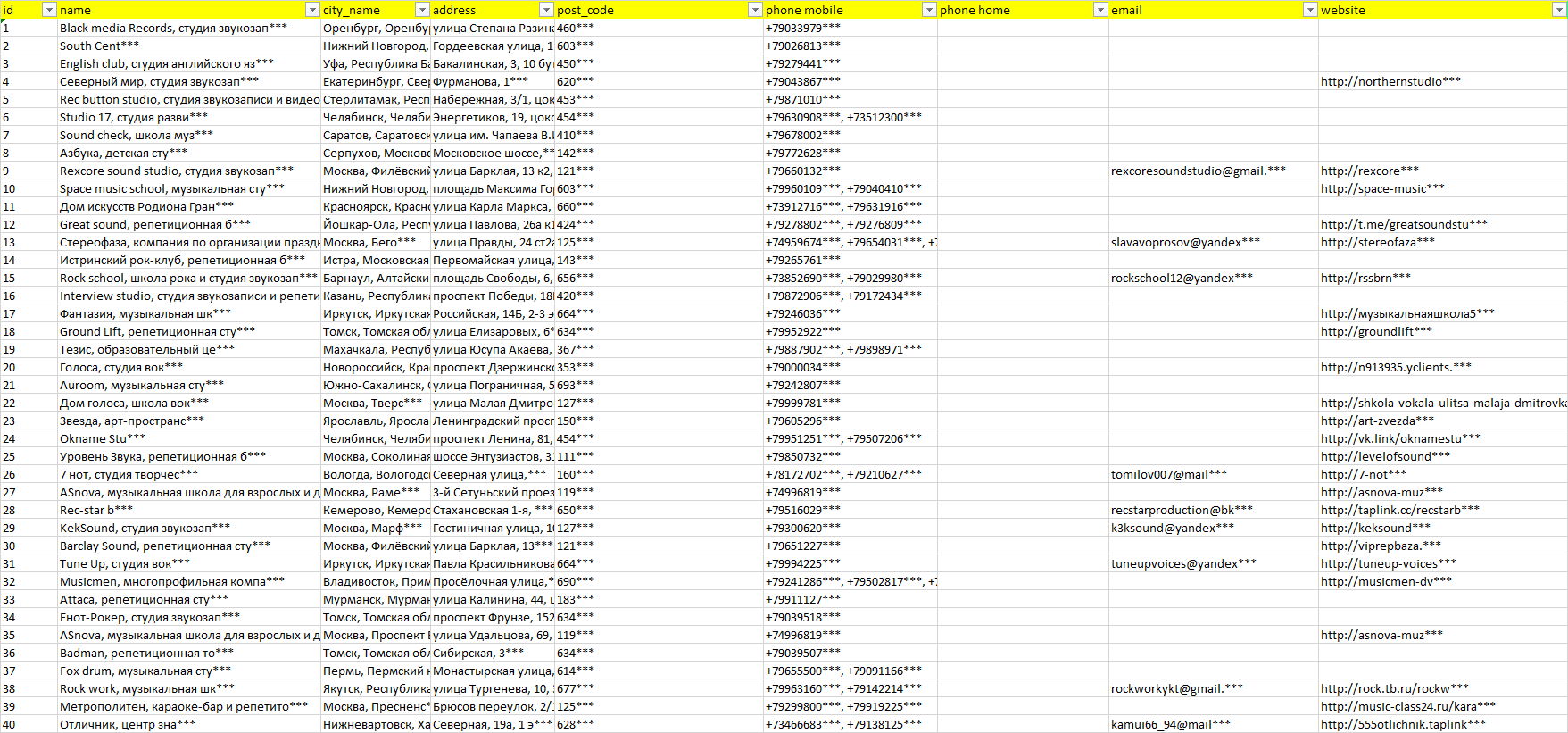 База организаций репетиционные студии, вся Россия в формате Excel с эл. почтами, телефонами, сайтами, ссылками на соц сети, координатами и другой информацией. Скачайте демо версию, чтобы ознакомиться с данными.