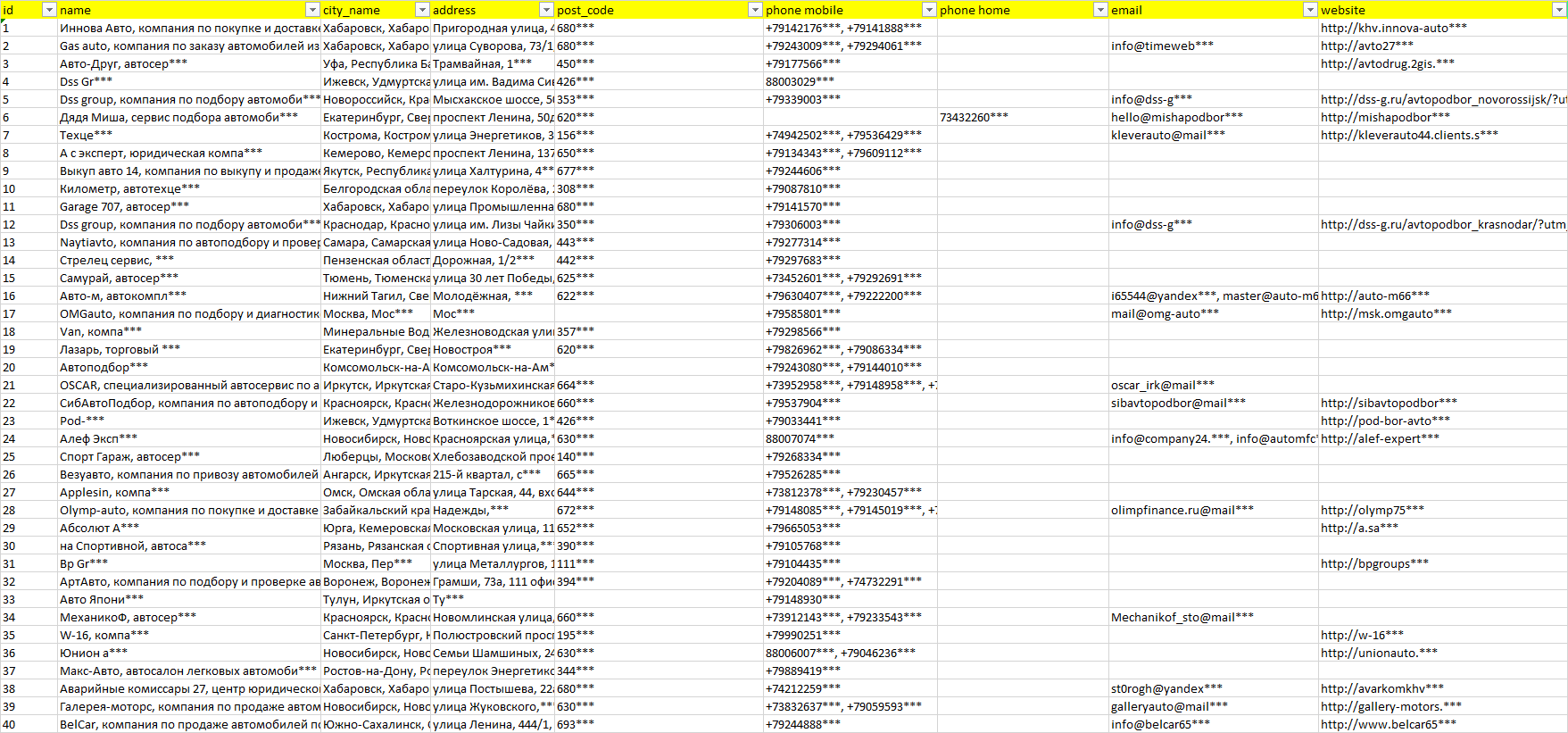 База компаний подбор автомобиля перед покупкой, вся РФ в формате Excel с эл. почтами, телефонами, сайтами, ссылками на соц сети, координатами и другой информацией. Скачайте демо версию, чтобы ознакомиться с данными.