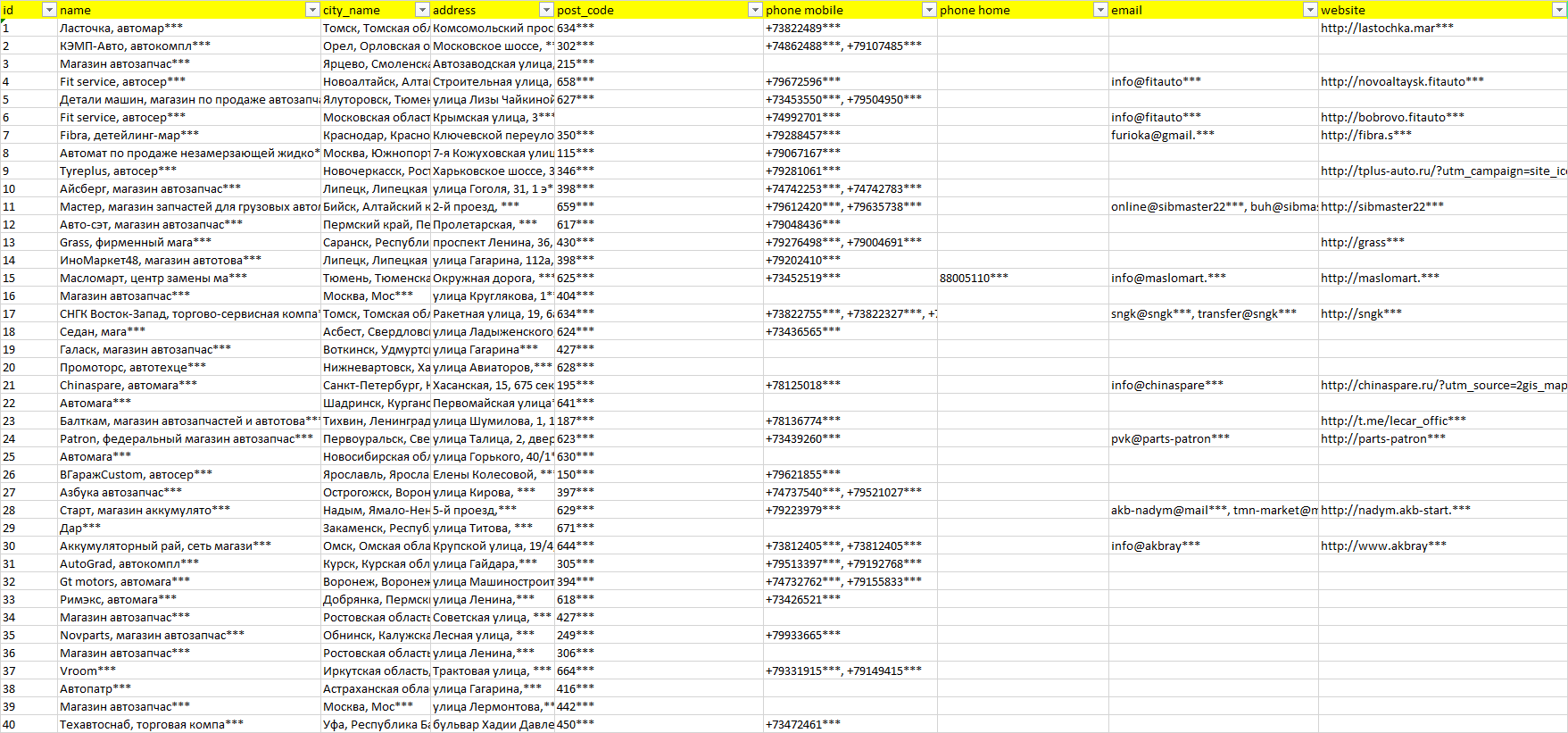 База организаций автохимия, вся Россия в формате Excel с эл. почтами, телефонами, сайтами, ссылками на соц сети, координатами и другой информацией. Скачайте демо версию, чтобы ознакомиться с данными.