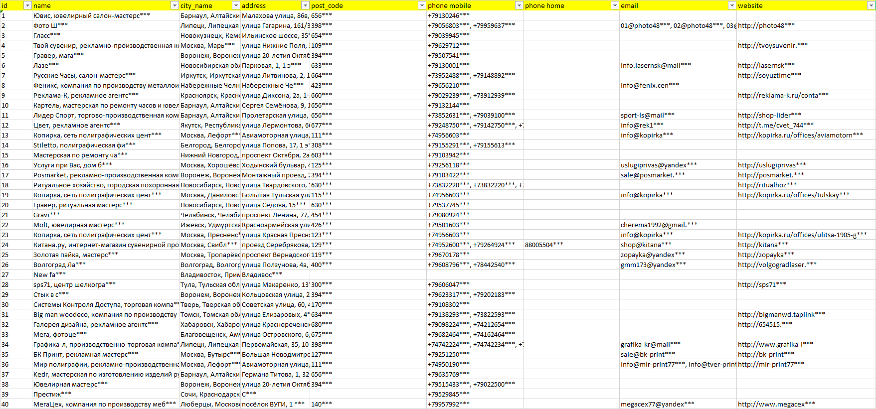 Мы автоматически собираем такие данные с различных открытых источников, обрабатываем, структурирует и упорядочиваем их, предоставляя пользователю возможность скачать результат в формате Excel. По принципу работы наш сервис аналогичен поисковым системам, таким как Google или Яндекс, но с возможностью экспорта найденной информации в удобном табличном виде.