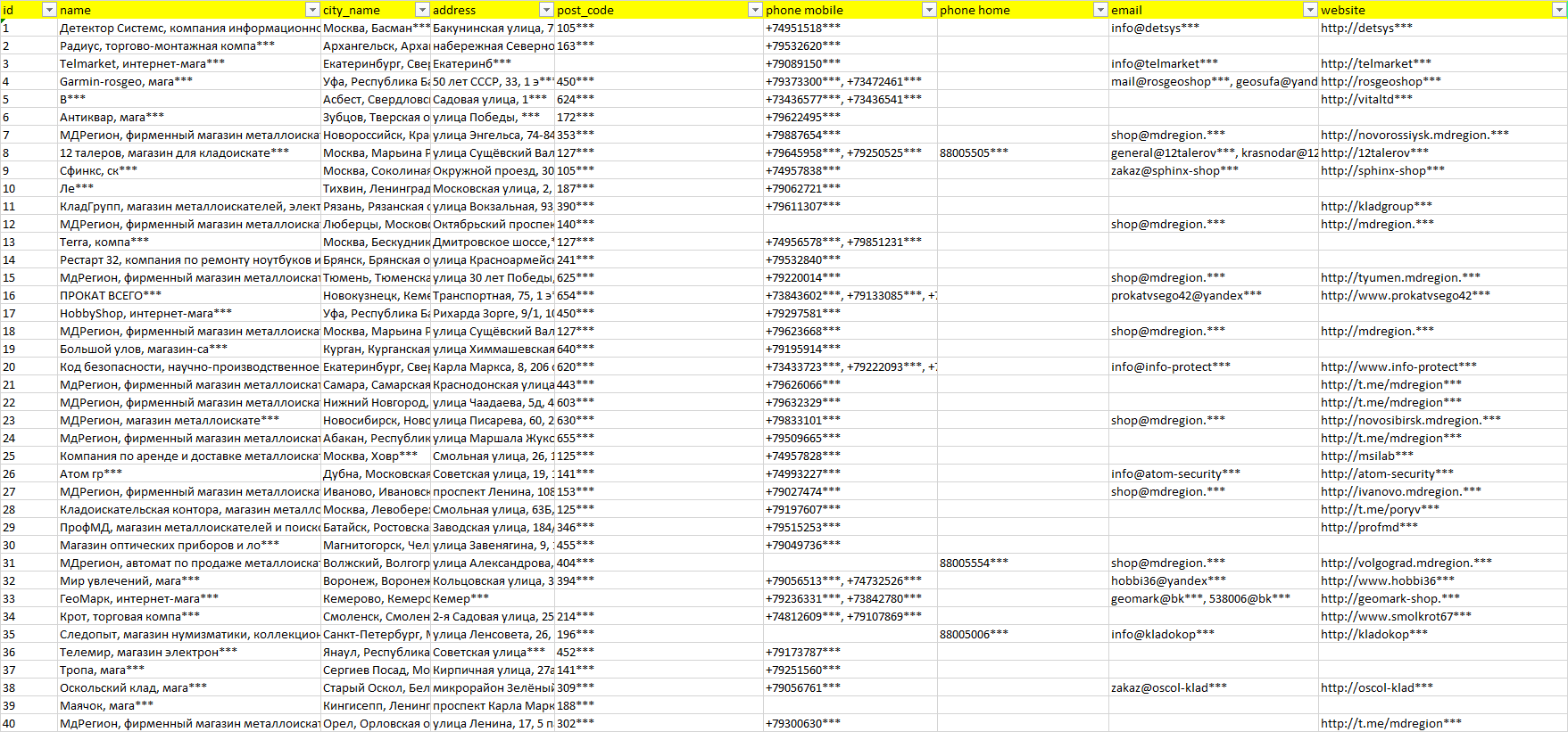 База организаций металлоискатели, вся Россия в формате Excel с эл. почтами, телефонами, сайтами, ссылками на соц сети, координатами и другой информацией. Скачайте демо версию, чтобы ознакомиться с данными.