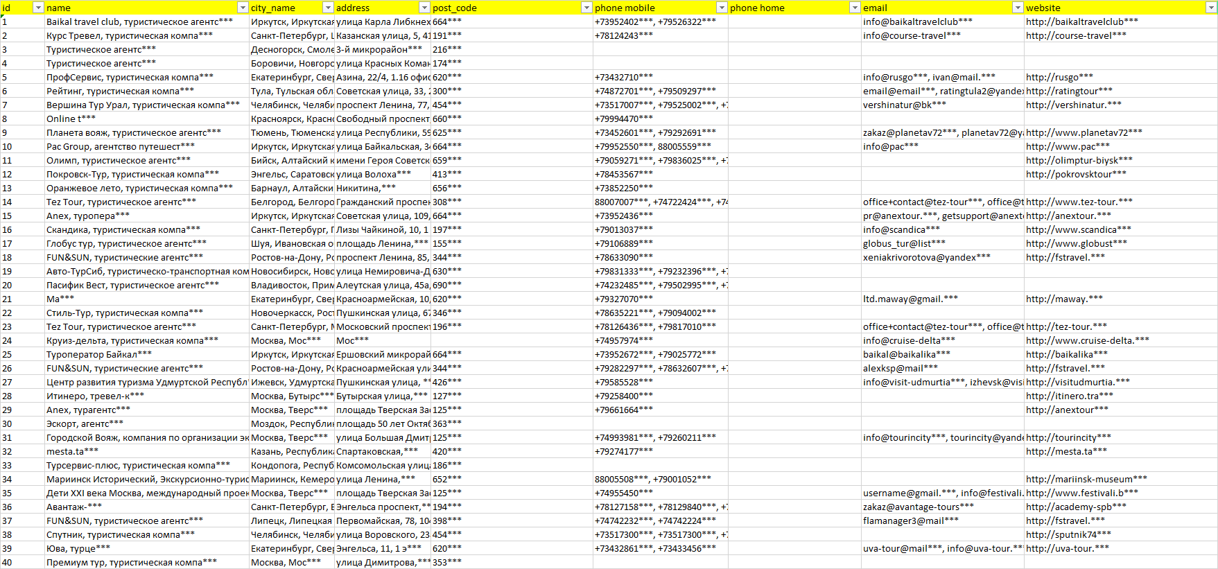 База организаций туроператоры, вся Россия в формате Excel с эл. почтами, телефонами, сайтами, ссылками на соц сети, координатами и другой информацией. Скачайте демо версию, чтобы ознакомиться с данными.
