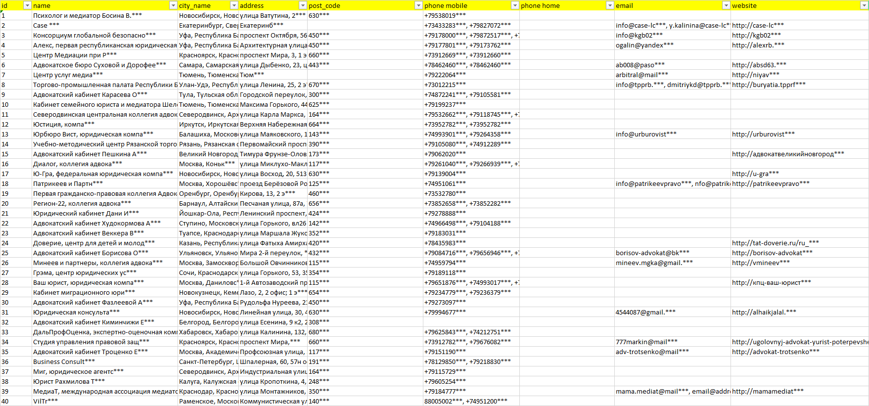 База организаций услуги медиаторов, вся Россия в формате Excel с эл. почтами, телефонами, сайтами, ссылками на соц сети, координатами и другой информацией. Скачайте демо версию, чтобы ознакомиться с данными.