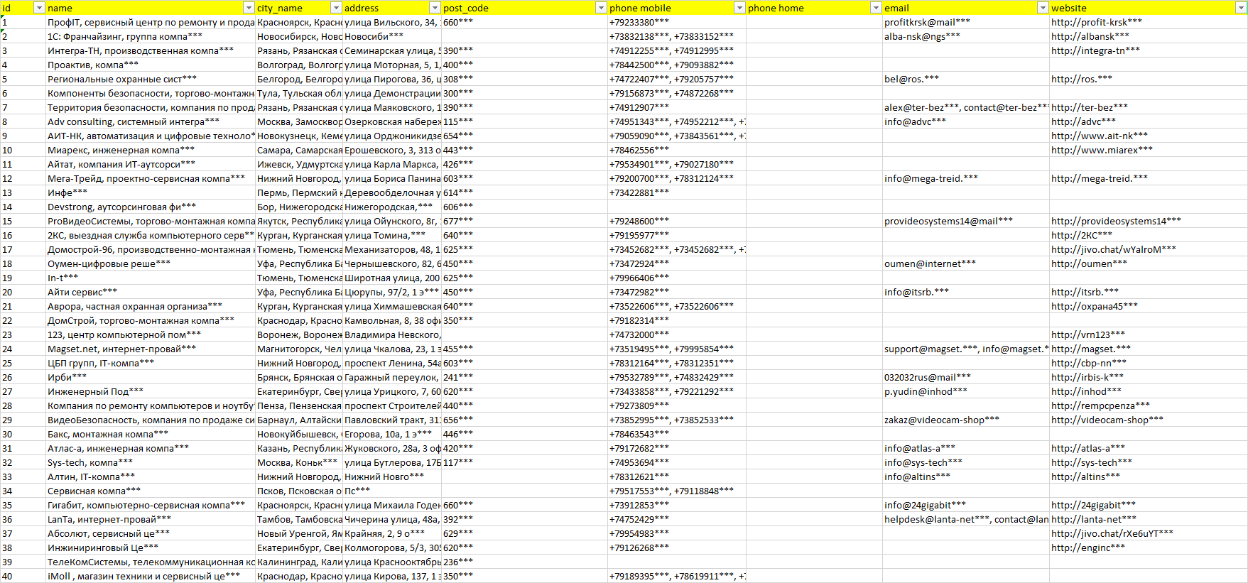 База организаций монтаж компьютерных сетей, вся Россия в формате Excel с эл. почтами, телефонами, сайтами, ссылками на соц сети, координатами и другой информацией. Скачайте демо версию, чтобы ознакомиться с данными.