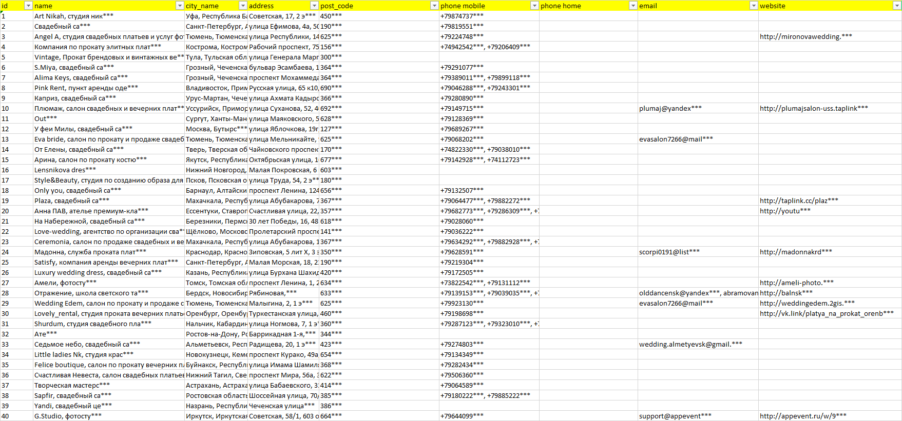 База организаций прокат свадебных вечерних платьев, вся Россия в формате Excel с эл. почтами, телефонами, сайтами, ссылками на соц сети, координатами и другой информацией. Скачайте демо версию, чтобы ознакомиться с данными.