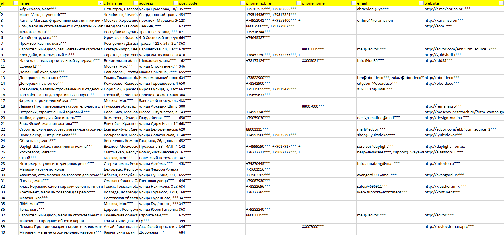 База организаций обои, вся Россия в формате Excel с эл. почтами, телефонами, сайтами, ссылками на соц сети, координатами и другой информацией. Скачайте демо версию, чтобы ознакомиться с данными.