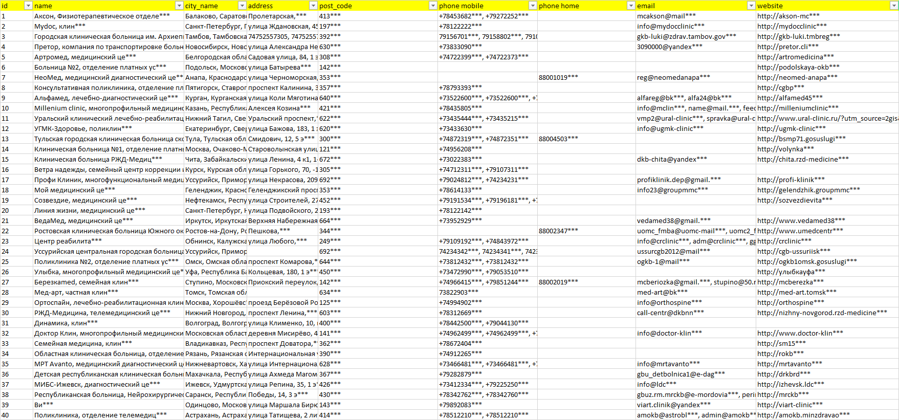 База компаний нейрохирург, вся РФ в формате Excel с эл. почтами, телефонами, сайтами, ссылками на соц сети, координатами и другой информацией. Скачайте демо версию, чтобы ознакомиться с данными.