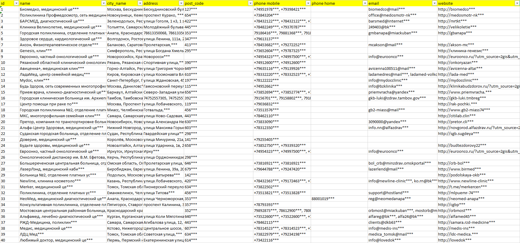 База компаний онколог, вся РФ в формате Excel с эл. почтами, телефонами, сайтами, ссылками на соц сети, координатами и другой информацией. Скачайте демо версию, чтобы ознакомиться с данными.