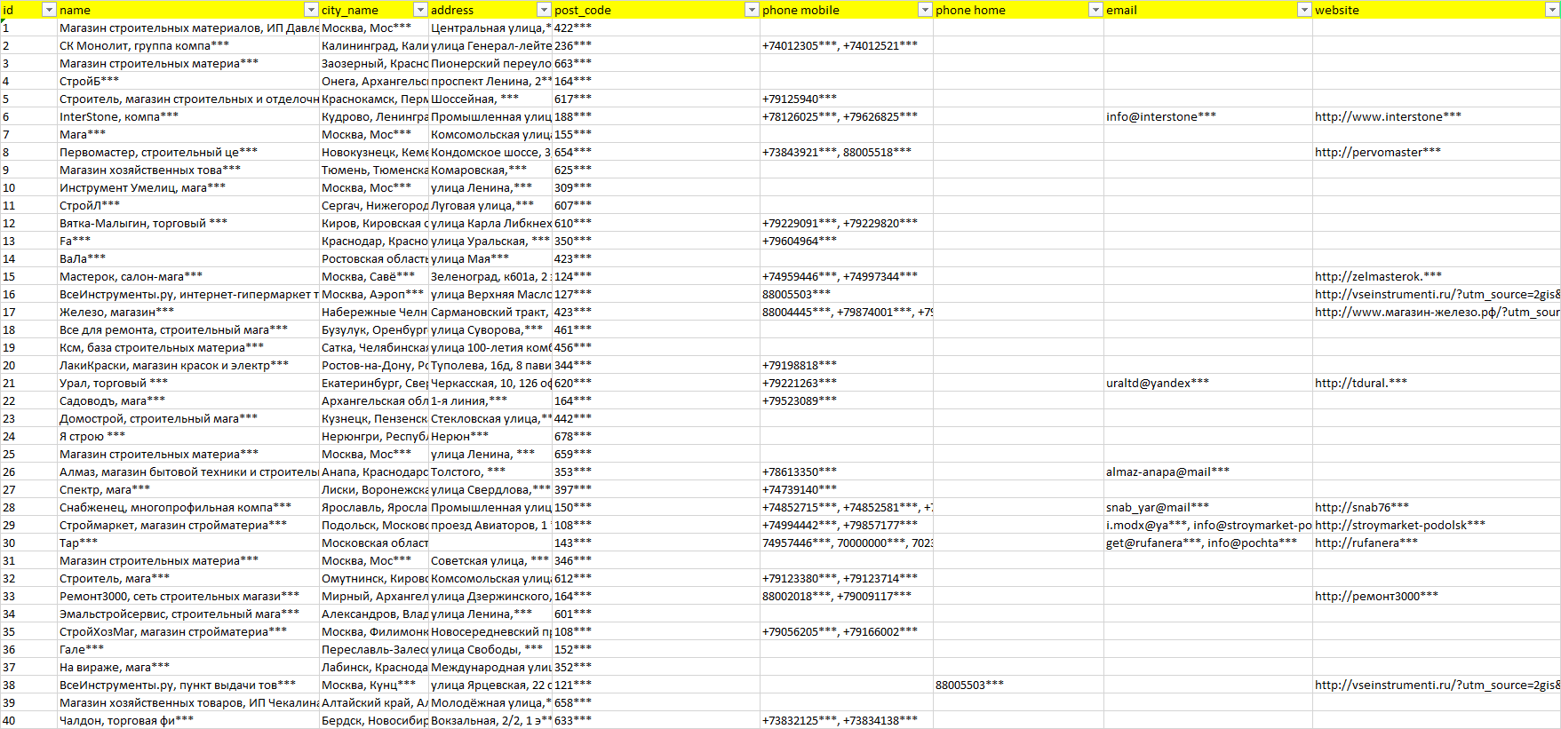 База организаций стройматериалы, вся Россия в формате Excel с эл. почтами, телефонами, сайтами, ссылками на соц сети, координатами и другой информацией. Скачайте демо версию, чтобы ознакомиться с данными.