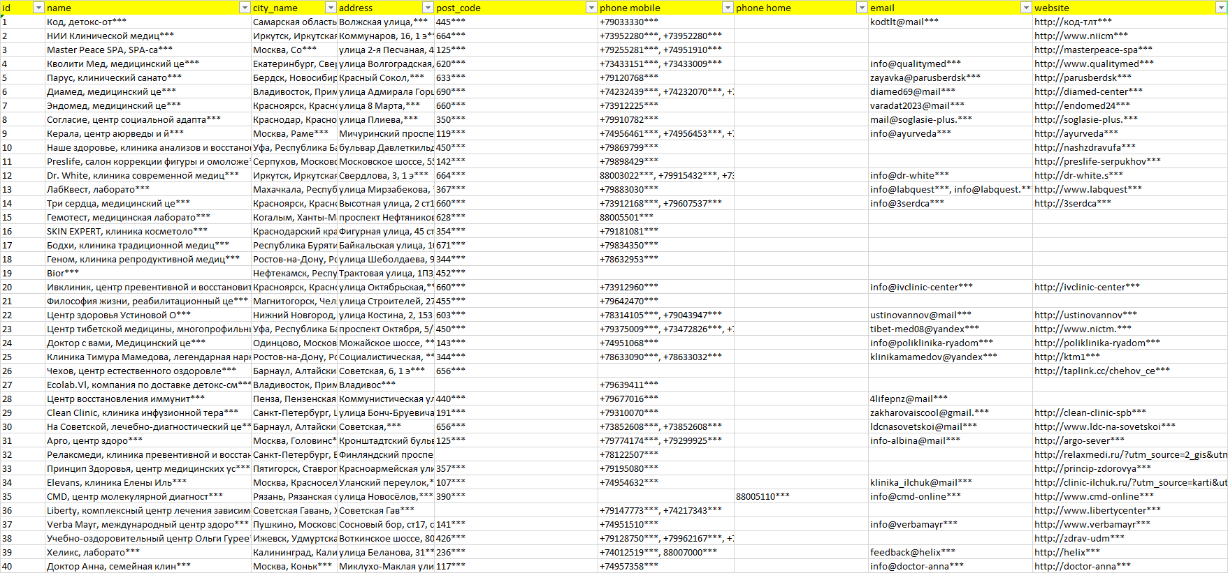 База организаций очищение организма, вся Россия в формате Excel с эл. почтами, телефонами, сайтами, ссылками на соц сети, координатами и другой информацией. Скачайте демо версию, чтобы ознакомиться с данными.