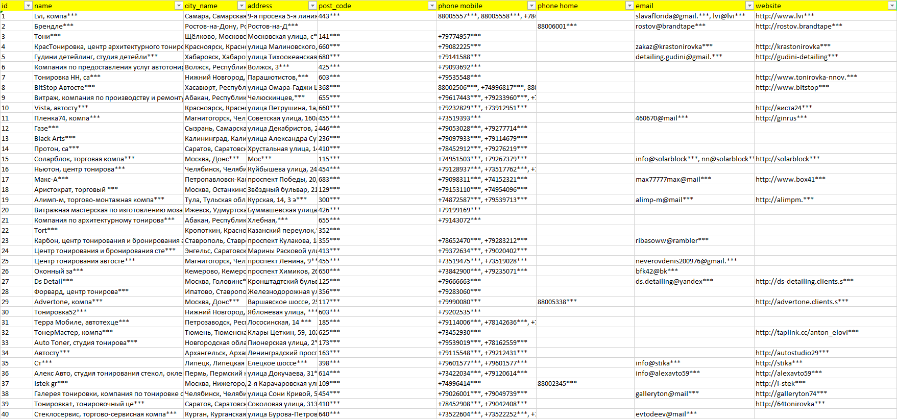База организаций тонирование стёкол зданий, вся Россия в формате Excel с эл. почтами, телефонами, сайтами, ссылками на соц сети, координатами и другой информацией. Скачайте демо версию, чтобы ознакомиться с данными.