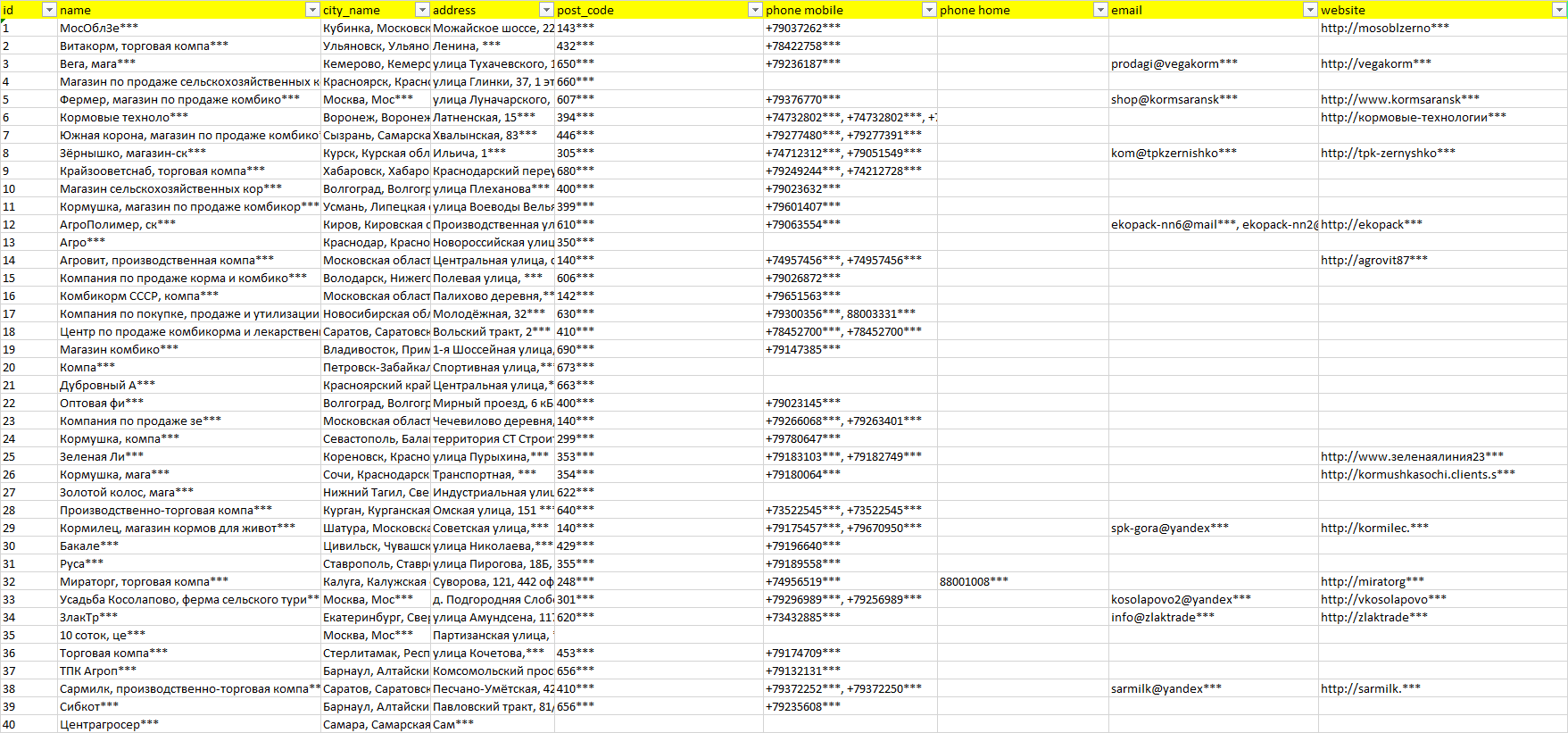 База организаций сельхозкорма, вся Россия в формате Excel с эл. почтами, телефонами, сайтами, ссылками на соц сети, координатами и другой информацией. Скачайте демо версию, чтобы ознакомиться с данными.