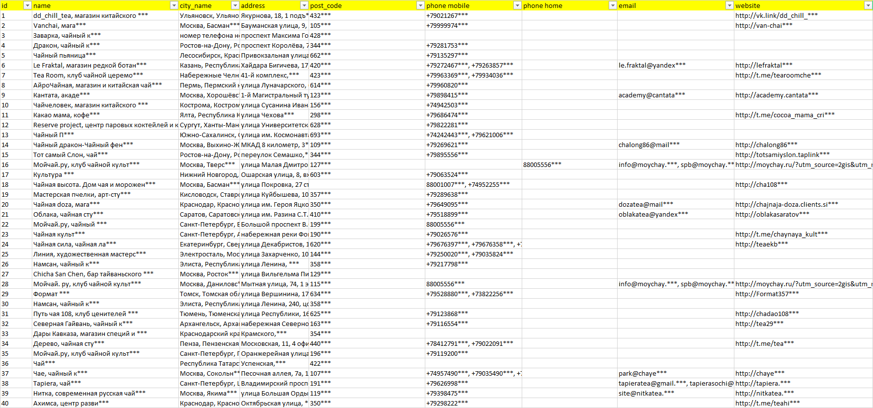 База компаний чайные клубы, вся РФ в формате Excel с эл. почтами, телефонами, сайтами, ссылками на соц сети, координатами и другой информацией. Скачайте демо версию, чтобы ознакомиться с данными.