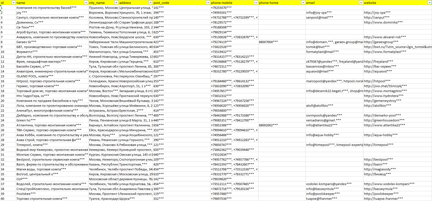 База организаций строительство бассейнов и аквапарков, вся Россия в формате Excel с эл. почтами, телефонами, сайтами, ссылками на соц сети, координатами и другой информацией. Скачайте демо версию, чтобы ознакомиться с данными.
