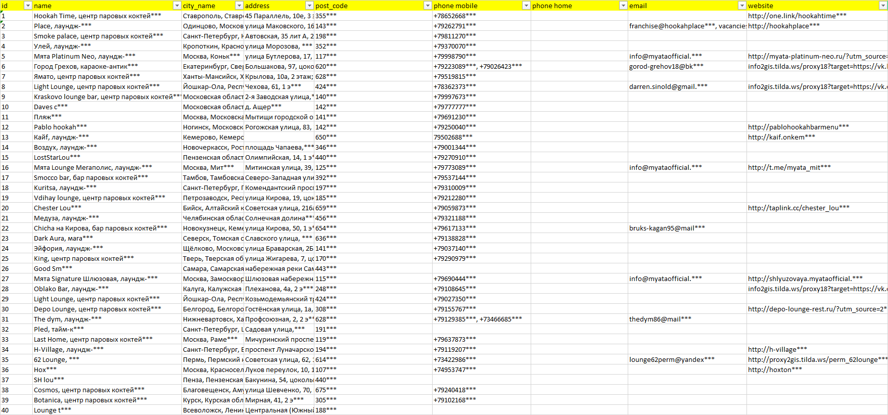 База компаний центры паровых коктейлей, вся РФ в формате Excel с эл. почтами, телефонами, сайтами, ссылками на соц сети, координатами и другой информацией. Скачайте демо версию, чтобы ознакомиться с данными.
