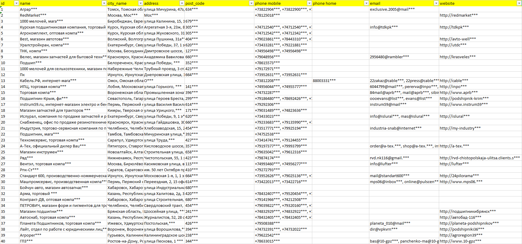 База компаний подшипники, вся РФ в формате Excel с эл. почтами, телефонами, сайтами, ссылками на соц сети, координатами и другой информацией. Скачайте демо версию, чтобы ознакомиться с данными.