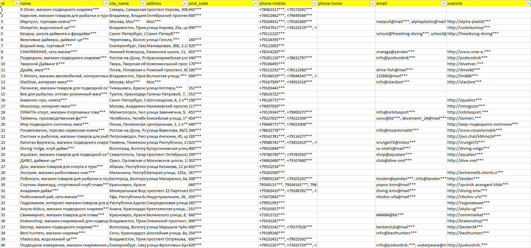 База компаний подводное снаряжение, вся РФ в формате Excel с эл. почтами, телефонами, сайтами, ссылками на соц сети, координатами и другой информацией. Скачайте демо версию, чтобы ознакомиться с данными.