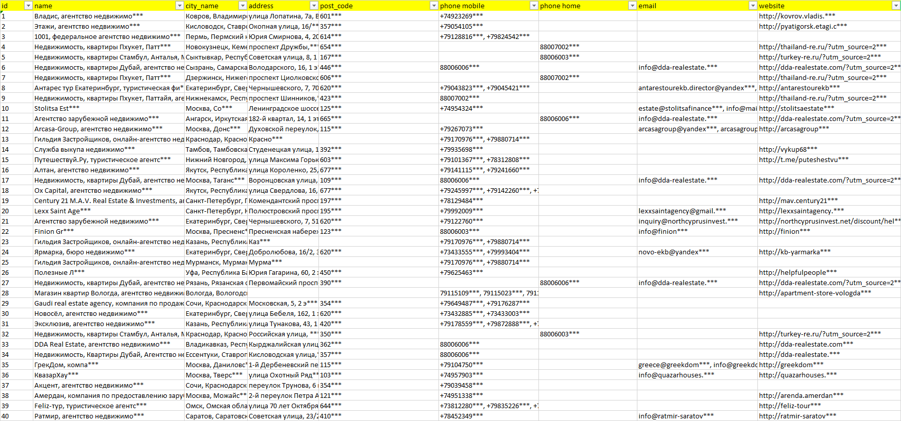 База организаций недвижимость за рубежом, вся Россия в формате Excel с эл. почтами, телефонами, сайтами, ссылками на соц сети, координатами и другой информацией. Скачайте демо версию, чтобы ознакомиться с данными.