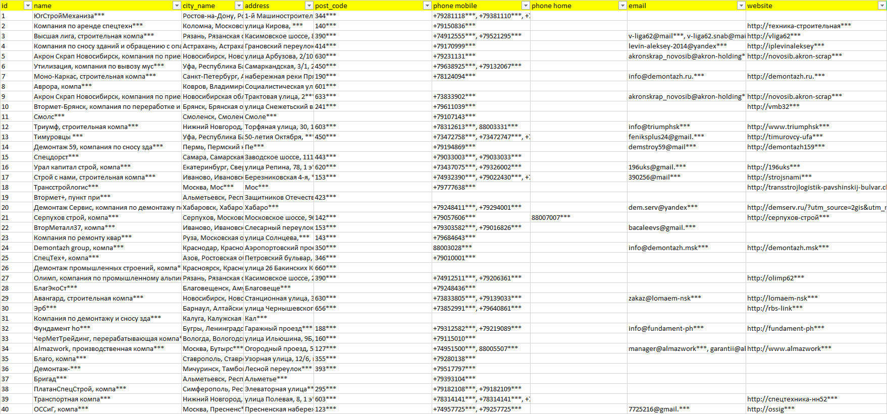 База организаций снос зданий, вся Россия в формате Excel с эл. почтами, телефонами, сайтами, ссылками на соц сети, координатами и другой информацией. Скачайте демо версию, чтобы ознакомиться с данными.