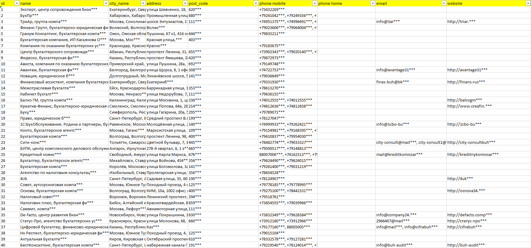 База организаций бухгалтерские услуги, вся Россия в формате Excel с эл. почтами, телефонами, сайтами, ссылками на соц сети, координатами и другой информацией. Скачайте демо версию, чтобы ознакомиться с данными.