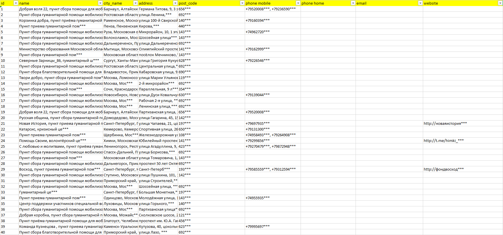 База организаций приём гуманитарной помощи, вся Россия в формате Excel с эл. почтами, телефонами, сайтами, ссылками на соц сети, координатами и другой информацией. Скачайте демо версию, чтобы ознакомиться с данными.