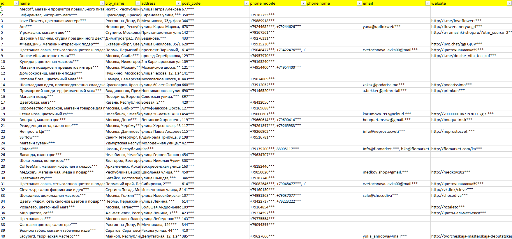 Мы автоматически собираем такие данные с различных открытых источников, обрабатываем, структурирует и упорядочиваем их, предоставляя пользователю возможность скачать результат в формате Excel. По принципу работы наш сервис аналогичен поисковым системам, таким как Google или Яндекс, но с возможностью экспорта найденной информации в удобном табличном виде.