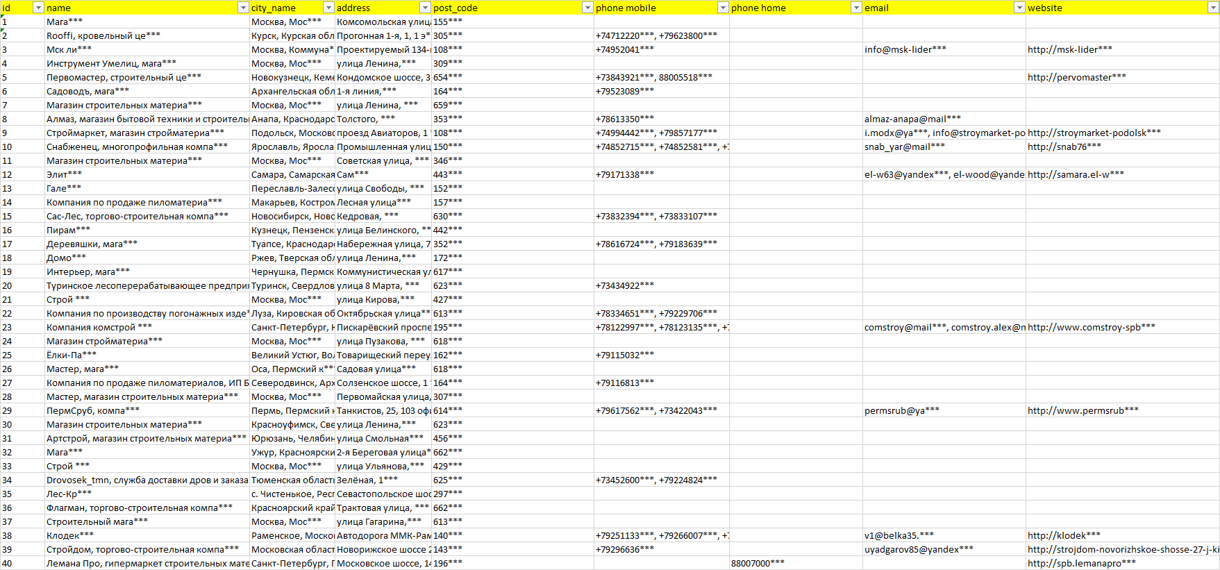 База компаний пило- и лесоматериалы, вся РФ в формате Excel с эл. почтами, телефонами, сайтами, ссылками на соц сети, координатами и другой информацией. Скачайте демо версию, чтобы ознакомиться с данными.