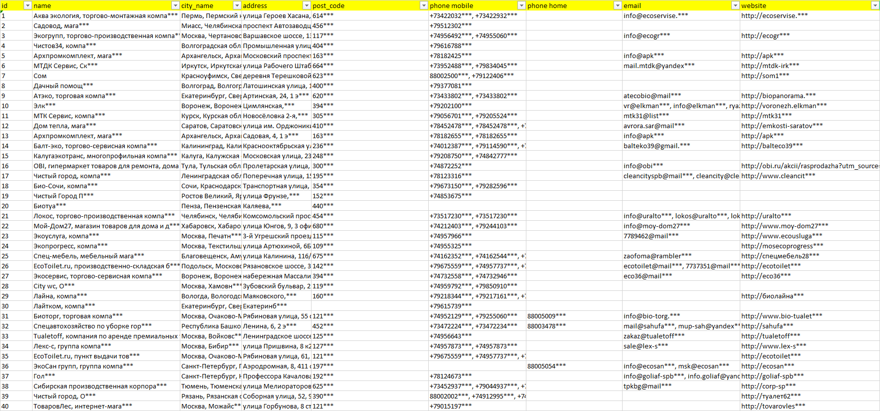 База организаций биотуалеты, вся Россия в формате Excel с эл. почтами, телефонами, сайтами, ссылками на соц сети, координатами и другой информацией. Скачайте демо версию, чтобы ознакомиться с данными.