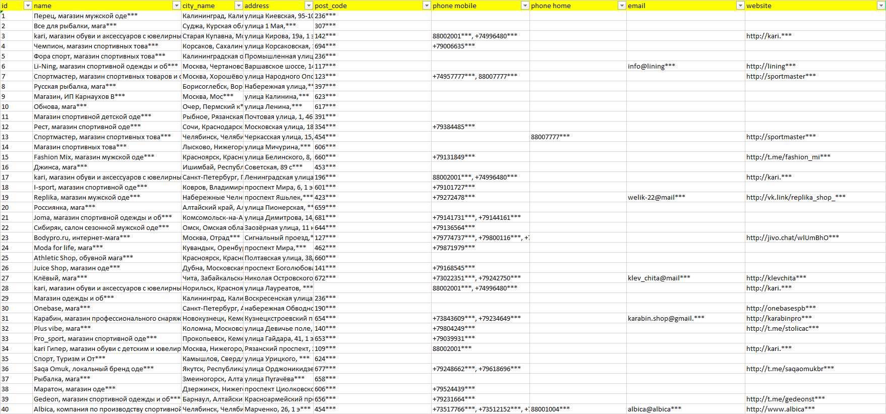База компаний спортивная одежда и обувь, вся РФ в формате Excel с эл. почтами, телефонами, сайтами, ссылками на соц сети, координатами и другой информацией. Скачайте демо версию, чтобы ознакомиться с данными.