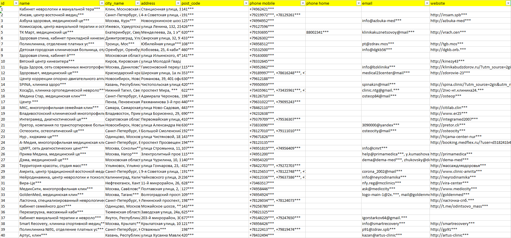 База компаний мануальный терапевт, вся РФ в формате Excel с эл. почтами, телефонами, сайтами, ссылками на соц сети, координатами и другой информацией. Скачайте демо версию, чтобы ознакомиться с данными.