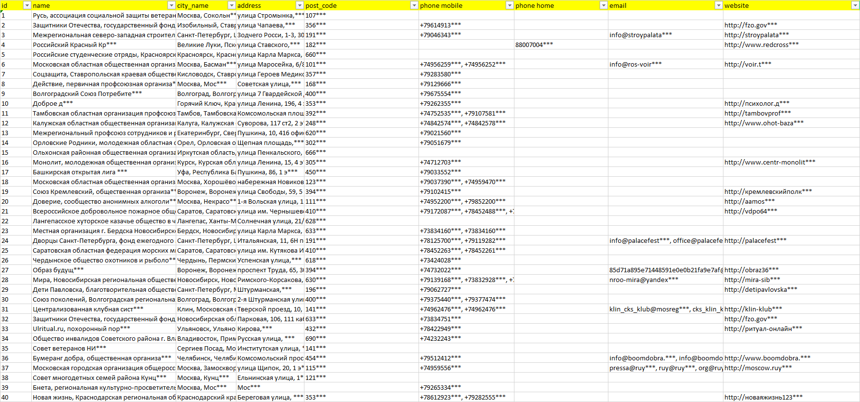База организаций общественные организации, вся Россия в формате Excel с эл. почтами, телефонами, сайтами, ссылками на соц сети, координатами и другой информацией. Скачайте демо версию, чтобы ознакомиться с данными.