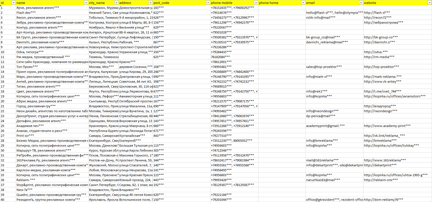 База компаний световая реклама, вся РФ в формате Excel с эл. почтами, телефонами, сайтами, ссылками на соц сети, координатами и другой информацией. Скачайте демо версию, чтобы ознакомиться с данными.
