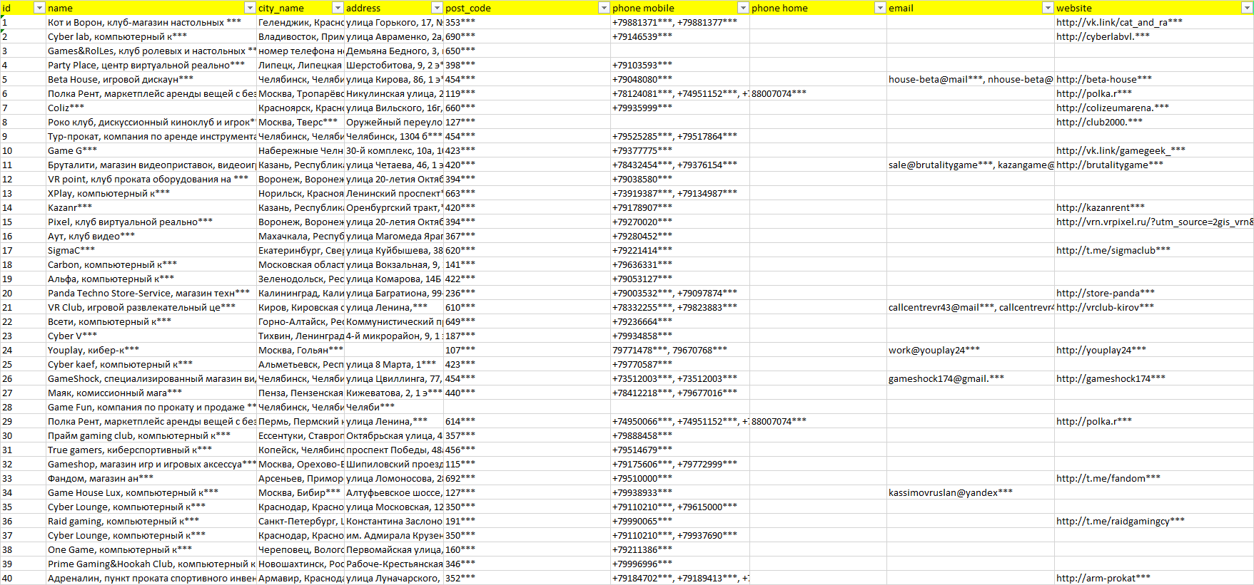 База организаций прокат игровых приставок настольных игр, вся Россия в формате Excel с эл. почтами, телефонами, сайтами, ссылками на соц сети, координатами и другой информацией. Скачайте демо версию, чтобы ознакомиться с данными.
