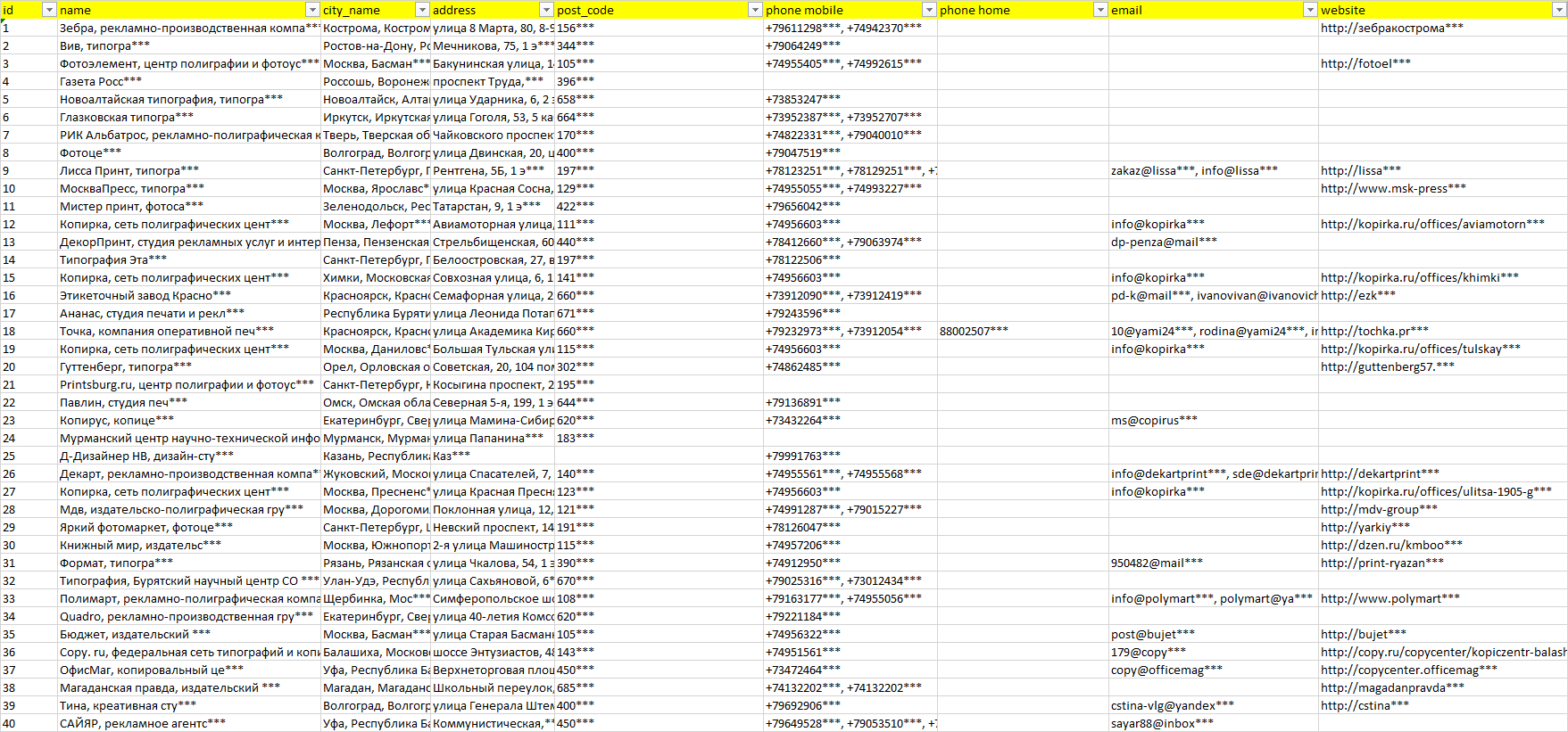 База компаний предпечатная подготовка, вся РФ в формате Excel с эл. почтами, телефонами, сайтами, ссылками на соц сети, координатами и другой информацией. Скачайте демо версию, чтобы ознакомиться с данными.