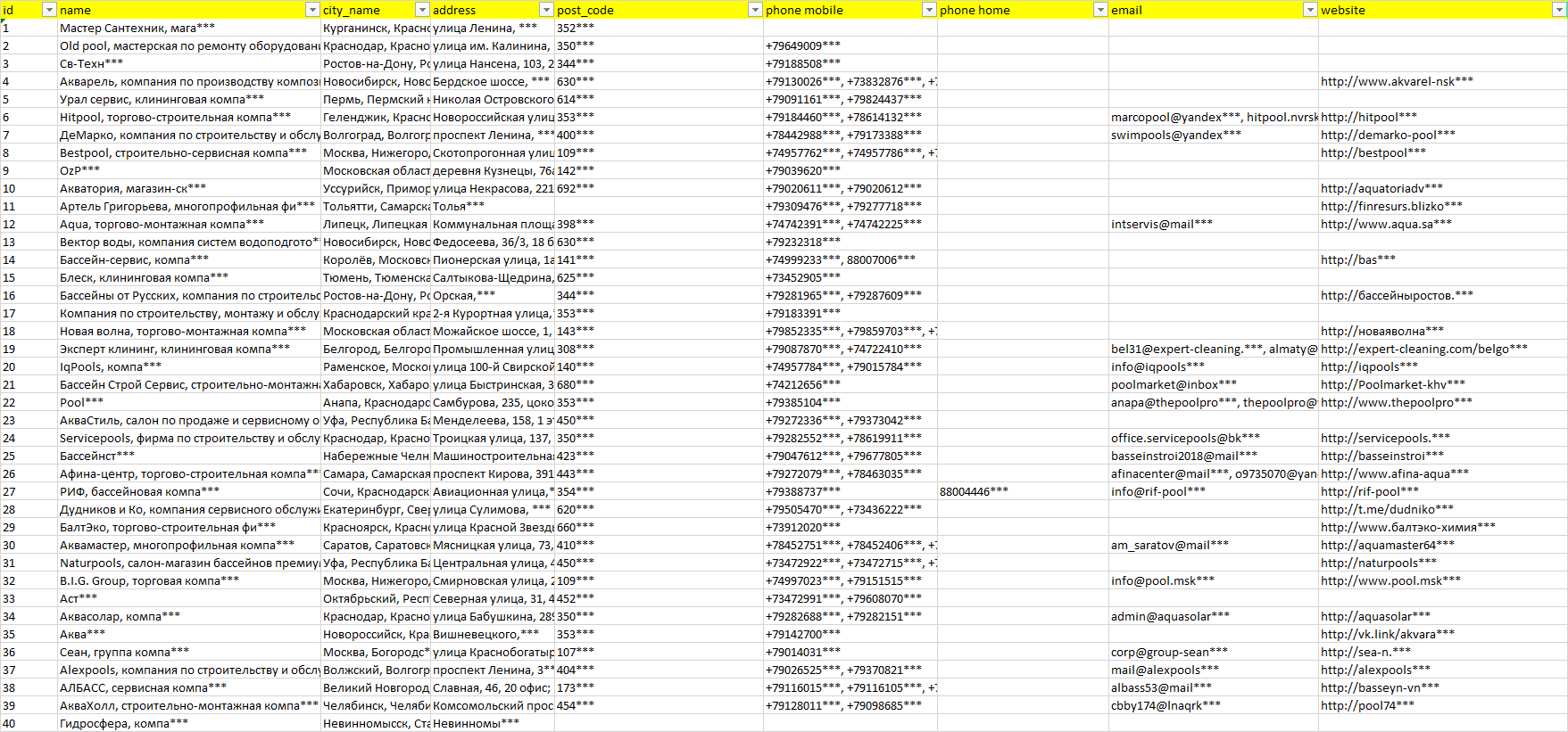 База компаний обслуживание бассейнов, вся РФ в формате Excel с эл. почтами, телефонами, сайтами, ссылками на соц сети, координатами и другой информацией. Скачайте демо версию, чтобы ознакомиться с данными.