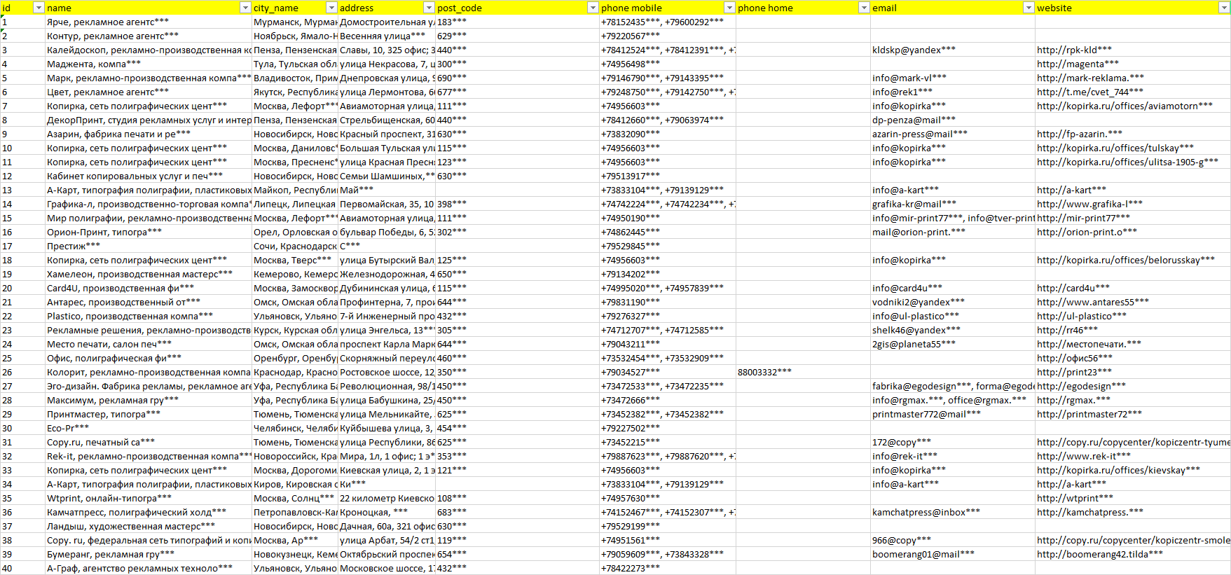 Мы автоматически собираем такие данные с различных открытых источников, обрабатываем, структурирует и упорядочиваем их, предоставляя пользователю возможность скачать результат в формате Excel. По принципу работы наш сервис аналогичен поисковым системам, таким как Google или Яндекс, но с возможностью экспорта найденной информации в удобном табличном виде.