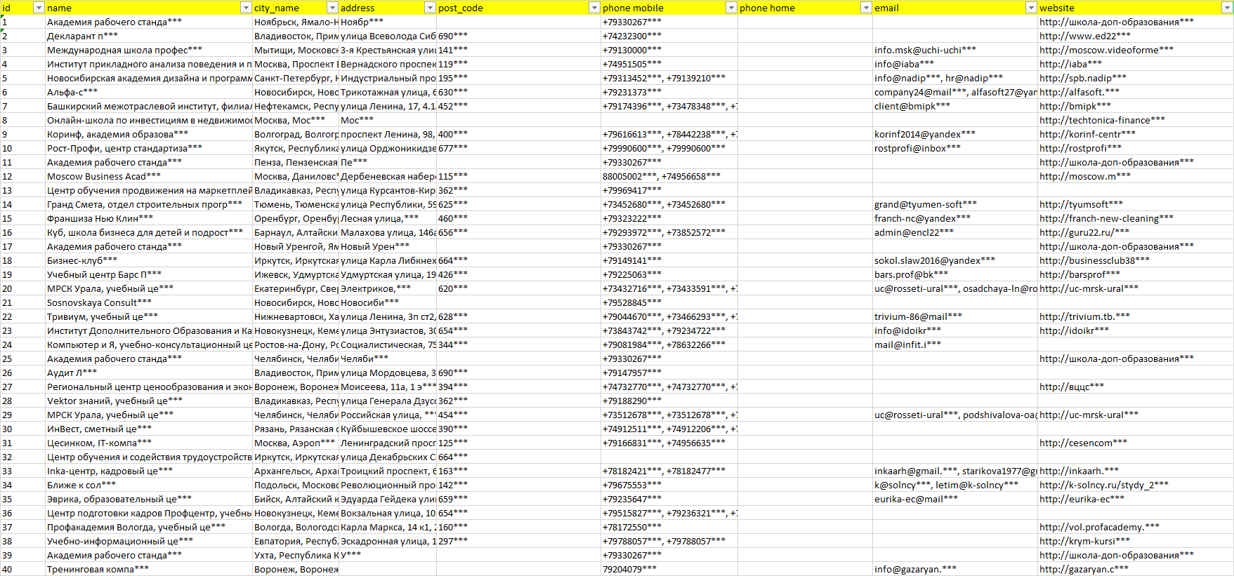 База организаций обучение бизнес-профессиям, вся Россия в формате Excel с эл. почтами, телефонами, сайтами, ссылками на соц сети, координатами и другой информацией. Скачайте демо версию, чтобы ознакомиться с данными.