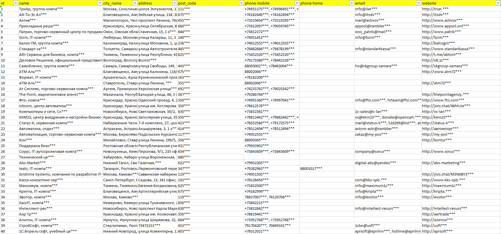 База компаний автоматизация торговли, вся РФ в формате Excel с эл. почтами, телефонами, сайтами, ссылками на соц сети, координатами и другой информацией. Скачайте демо версию, чтобы ознакомиться с данными.