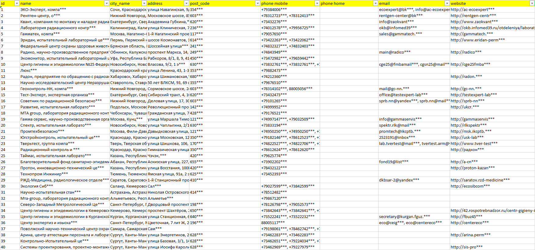 База организаций радиационный контроль, вся Россия в формате Excel с эл. почтами, телефонами, сайтами, ссылками на соц сети, координатами и другой информацией. Скачайте демо версию, чтобы ознакомиться с данными.