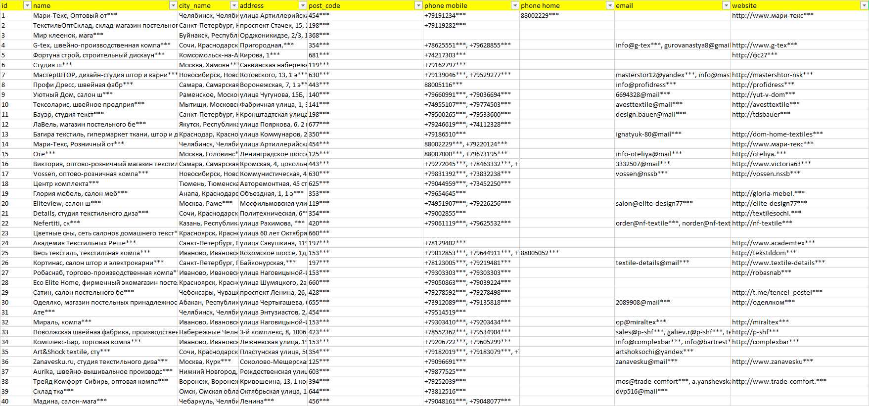 База компаний текстиль для ресторанов и гостиниц, вся РФ в формате Excel с эл. почтами, телефонами, сайтами, ссылками на соц сети, координатами и другой информацией. Скачайте демо версию, чтобы ознакомиться с данными.