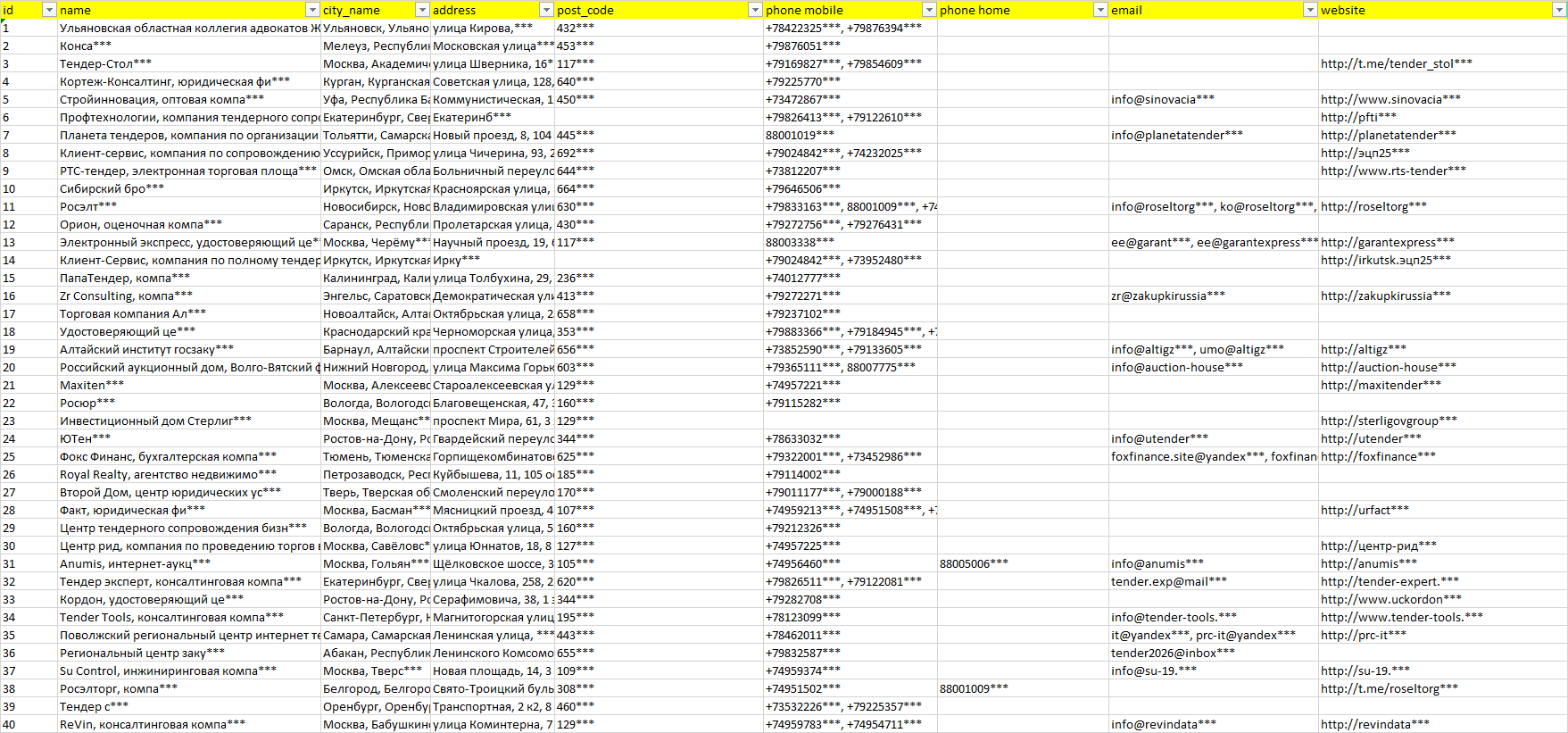 База организаций тендеры и аукционы, вся Россия в формате Excel с эл. почтами, телефонами, сайтами, ссылками на соц сети, координатами и другой информацией. Скачайте демо версию, чтобы ознакомиться с данными.