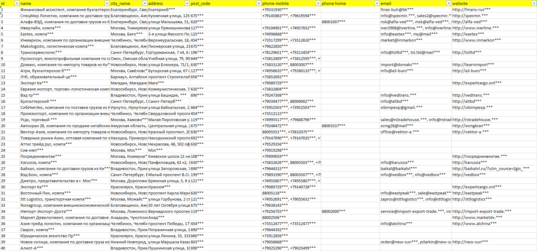 База компаний организация внешнеэкономической деятельности, вся РФ в формате Excel с эл. почтами, телефонами, сайтами, ссылками на соц сети, координатами и другой информацией. Скачайте демо версию, чтобы ознакомиться с данными.