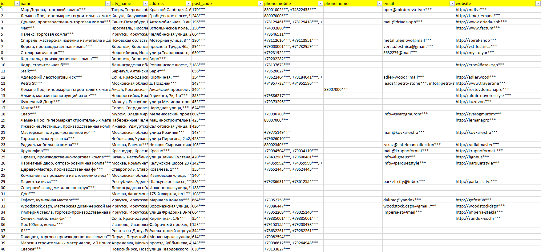 Мы автоматически собираем такие данные с различных открытых источников, обрабатываем, структурирует и упорядочиваем их, предоставляя пользователю возможность скачать результат в формате Excel. По принципу работы наш сервис аналогичен поисковым системам, таким как Google или Яндекс, но с возможностью экспорта найденной информации в удобном табличном виде.
