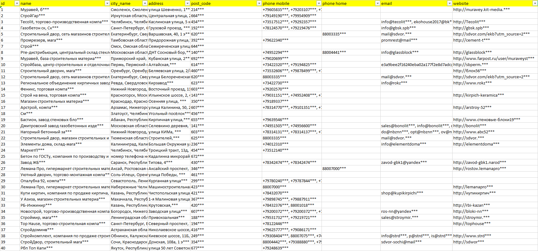 База организаций строительные блоки, вся Россия в формате Excel с эл. почтами, телефонами, сайтами, ссылками на соц сети, координатами и другой информацией. Скачайте демо версию, чтобы ознакомиться с данными.