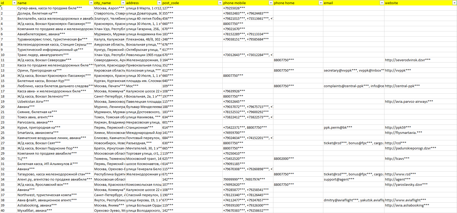 База организаций железнодорожные кассы, вся Россия в формате Excel с эл. почтами, телефонами, сайтами, ссылками на соц сети, координатами и другой информацией. Скачайте демо версию, чтобы ознакомиться с данными.