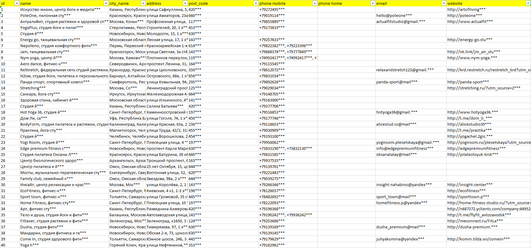 База компаний центры йоги, вся РФ в формате Excel с эл. почтами, телефонами, сайтами, ссылками на соц сети, координатами и другой информацией. Скачайте демо версию, чтобы ознакомиться с данными.