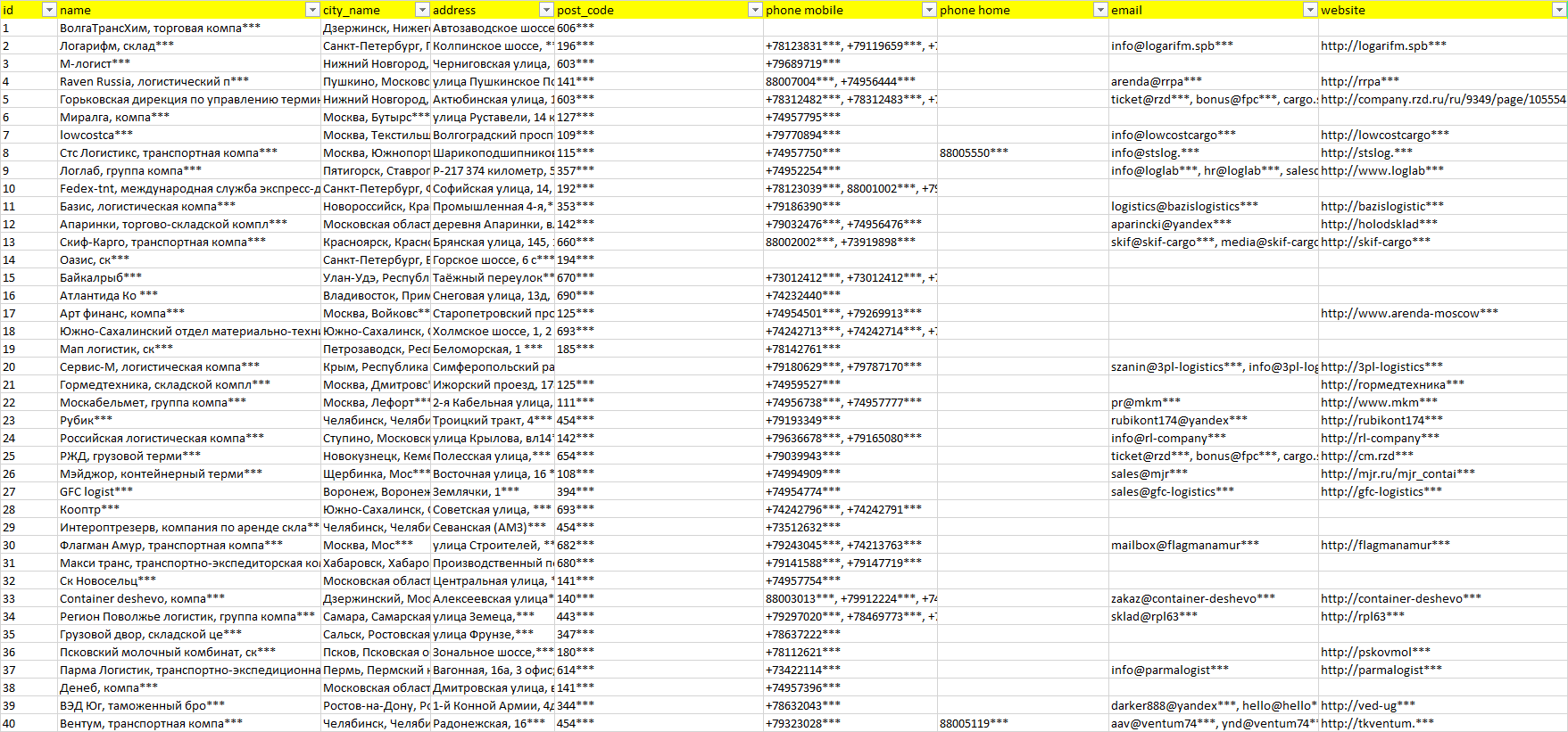 База организаций складское хранение, вся Россия в формате Excel с эл. почтами, телефонами, сайтами, ссылками на соц сети, координатами и другой информацией. Скачайте демо версию, чтобы ознакомиться с данными.